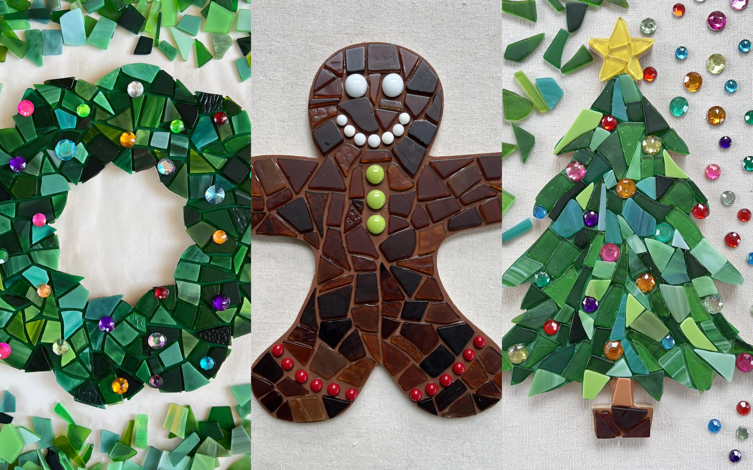 Choose your own Holiday Mosaic. Amanda is offering her classic Wreath, adorable Gingerbread Man, and Christmas Tree forms for our last Mosaic class of the year. Who doesn’t love options?